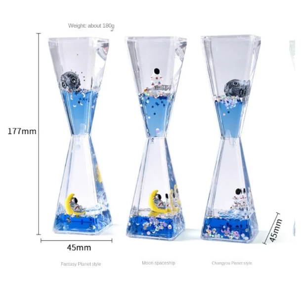 UZAY TEMALI DÖKÜLEN YAĞ KUM SAATİ 1. Akrilik malzeme. 2. Masaya, rafa veya masanın herhangi bir yerine yerleştirilebilen eğlenceli ve sevimli süslemeler için uygundur. 3. Güzel görünüm, astronotlar nasıl yerleştirildikleri önemli değildir her halükarda yüzer duruma geçerler. 4. Doğum günü, yıldönümü, düğün, babalar günü, anneler günü, ev dekorasyon için uygundur. Sıvı: mineral yağ + arıtılmış su Boyut: 17.4 x 5.5 x 4.8 cm Ambalaj listesi: 1 adet sıvı sürüklenen uzay temalı aksesuar