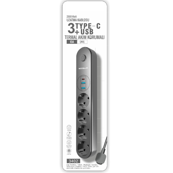 TERMAL AKIM KORUMALI 4 PRİZLİ, TYPE-C VE USB GİRİŞLİ UZATMA KABLOSU Ürün Özellikleri Yeni nesil cihazlarınız için gelişmiş ve güvenli enerji çözümü! Termal Akım Korumalı 4 Prizli Uzatma Kablosu, sadece elektrikli cihazlarınızı beslemekle kalmaz, aynı zamanda mobil cihazlarınızı en modern yöntemlerle şarj eder. 4 adet AC priz girişinin yanı sıra üzerinde yer alan 1 adet Type-C ve 2 adet USB girişi, güncel akıllı telefon ve tabletlerinizi adaptör kalabalığı olmadan doğrudan bağlamanıza olanak tanır. Termal akım koruma teknolojisi, aşırı ısınma ve voltaj dalgalanmalarına karşı çift katmanlı güvenlik sağlar. 2500 Watt yüksek güç kapasitesi ve 2 metre uzunluğundaki dayanıklı kablosu ile televizyon ünitelerinden çalışma masalarına kadar her alanda maksimum performans sunar. Isıya karşı dirençli gövde yapısı ve pratik açma/kapama anahtarı ile hem güvenliği hem de konforu bir arada sunan profesyonel bir enerji istasyonudur. Ürün Teknik Özellikleri Özellik Açıklama Priz Sayısı 4 Adet Akım Korumalı Priz USB Portları 1 Adet Type-C + 2 Adet USB Girişi Güç Kapasitesi 2500 Watt / 10A Çıkış Kablo Uzunluğu 2 Metre Yüksek Dirençli Kablo Güvenlik Termal Akım Koruması & Isıya Dayanıklı Gövde Kontrol Işıklı Açma/Kapama Anahtarı Uyumluluk Telefon, Tablet, Bilgisayar ve Tüm Elektronik Cihazlar Paket İçeriği 1 Adet Termal Akım Korumalı 4 Prizli USB Girişli Uzatma Kablosu