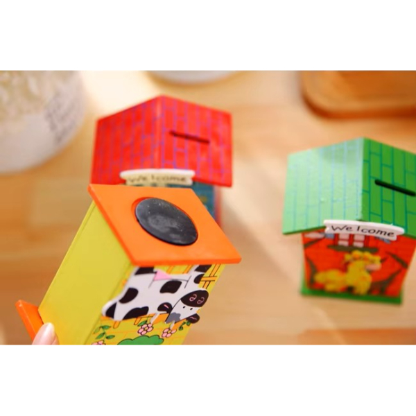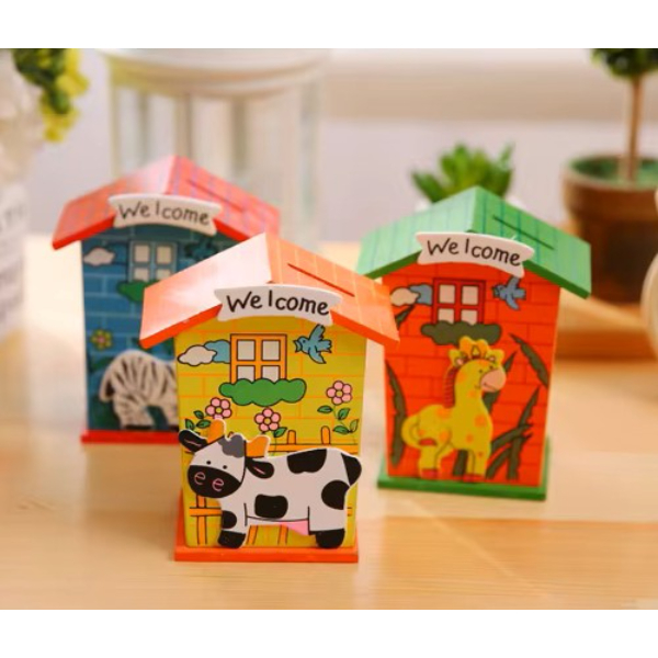 AHŞAP EV TASARIMLI KUMBARAÜrün ÖzellikleriÇocuklar için tasarlanmış hem dekoratif hem de fonksiyonel bir Ahşap Ev Tasarımlı Kumbara modelidir. Ahşap malzemeden üretilmiş olup dayanıklı bir yapıya sahiptir. Üzerinde yer alan renkli hayvan figürleri ve "Welcome" yazısı, çocukların ilgisini çekerken odalarına eğlenceli bir hava katar.Alt kısmında bulunan kapak sayesinde birikimler kolayca alınabilir ve yeniden kullanılabilir. Farklı renk ve desen seçenekleri ile her zevke hitap eder.Hem para biriktirme alışkanlığı kazandırmak hem de odada dekoratif bir obje olarak kullanılmak için ideal bir üründür. Hafif ve taşınabilir olması sayesinde istenilen her yerde rahatlıkla kullanılabilir.Eğitim materyali, hediye veya dekoratif amaçlarla tercih edilebilir.Çocukların finansal farkındalık geliştirmesine yardımcı olurken, odalarına şık bir görünüm kazandırır.Paket İçeriği1  adet Ahşap Ev Tasarımlı Kumbara