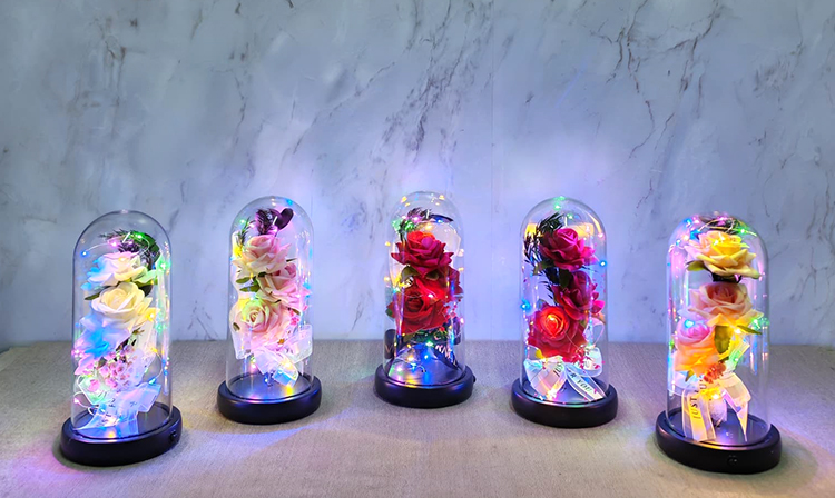 Işıklı Müzikli Cam Fanus İçinde Romantik Gül