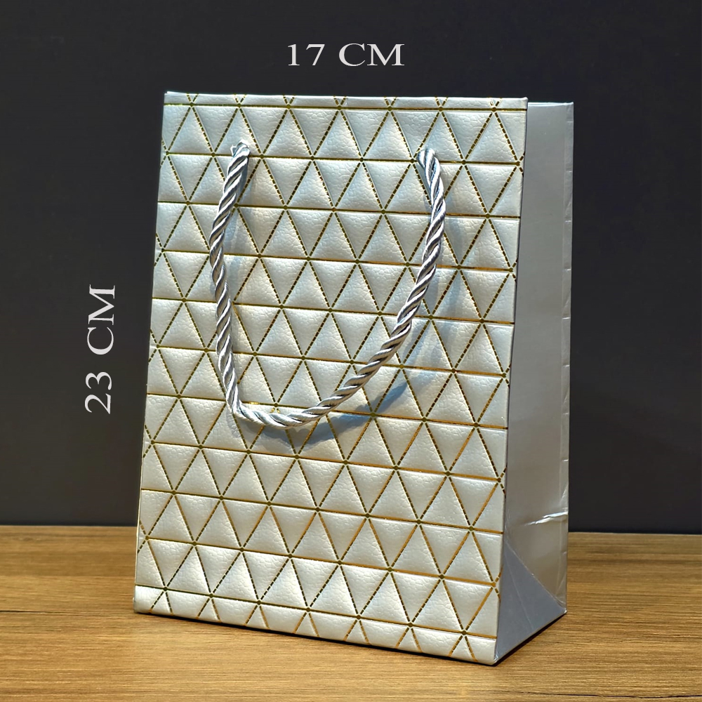 GÜMÜŞ GEOMETRİK DESENLİ ORTA BOY KARTON HEDİYE ÇANTASI  Ürün Özellikleri Hediyenize gümüşün modern ışıltısını ve asaletini katın! Gümüş Geometrik Desenli Orta Boy Karton Hediye Çantası, üç boyutlu dokusu ve göz alıcı metalik yüzeyiyle sunumlarınıza prestij katar. 23x17 cm boyutlarındaki ideal yapısı; parfümler, orta boy aksesuarlar, kişisel bakım setleri veya dekoratif objeler için en şık paketleme çözümüdür. Yüksek kaliteli ve dayanıklı kalın karton malzemeden üretilen gövdesi, üzerindeki geometrik kabartmalar sayesinde ışığı her açıdan estetik bir şekilde yansıtarak modern bir duruş sergiler. Asil gümüş tonu; yılbaşı, düğün, nişan, söz veya profesyonel kurumsal hediyeler için vazgeçilmez bir tercih oluşturur. Sağlam ve uyumlu gümüş tonlu ip sapları sayesinde hediyenizi büyük bir güven ve zarafetle sevdiklerinize ulaştırır. Ürün Teknik Özellikleri Özellik Açıklama Boyutlar 23 cm (Yükseklik) x 17 cm (Genişlik) Malzeme Birinci Sınıf Kaliteli ve Kalın Karton Tasarım Lüks Gümüş (Silver) Geometrik Kabartma Desenli Boyut Tipi Orta Boy (Medium) Taşıma Sapı Uyumlu Gümüş Tonlarında Dayanıklı İp Sap Kullanım Alanı Yılbaşı, Düğün, Kurumsal Hediyeler ve Özel Günler Paket İçeriği 1 Adet Gümüş Geometrik Desenli Orta Boy Karton Hediye Çantası (23x17 cm).