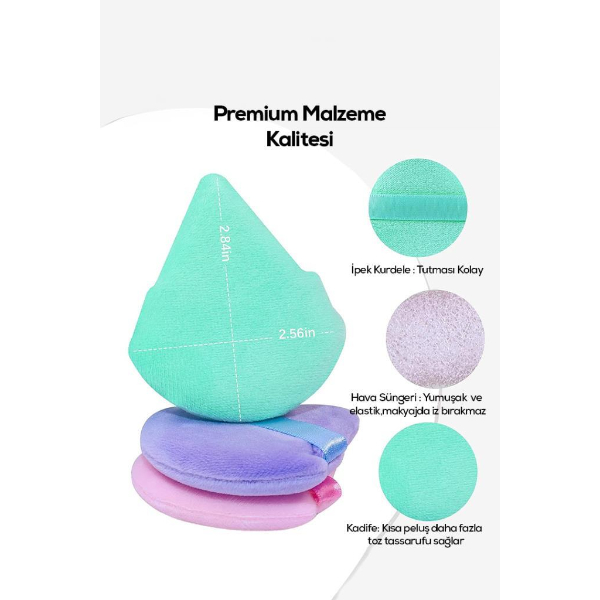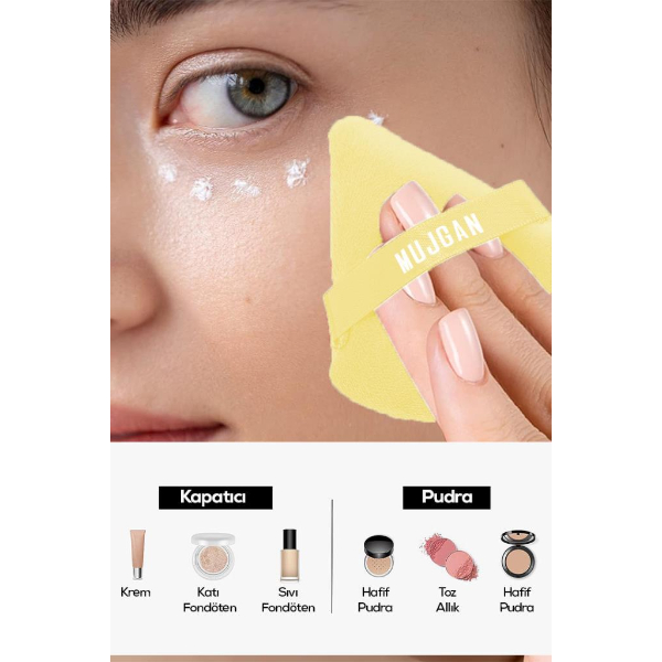 ÜÇGEN MAKYAJ SÜNGERİ PUF Ürün Özellikleri Üçgen makyaj süngeri puf, ten makyajını daha kontrollü ve pratik şekilde uygulamak için tasarlanmış çok yönlü bir makyaj aksesuarıdır. Özel üçgen formu sayesinde göz çevresi, burun kenarları ve çene gibi detaylı bölgelerde hassas uygulama imkânı sunar. Sivri uç kısmı dar alanlara kolayca ulaşırken, geniş ve dairesel yüzeyi yanaklar, alın ve diğer geniş bölgelerde fondötenin eşit şekilde dağıtılmasına yardımcı olur. Üçgen makyaj süngeri tasarımı sayesinde hem detay hem de geniş alan uygulamalarında tek ürünle etkili sonuç elde edilebilir. Yumuşak dokulu yüzeyi cilt üzerinde konforlu bir kullanım sunar ve makyajın daha pürüzsüz görünmesine katkı sağlar. Arka kısmında bulunan elastik bant sayesinde ele rahatça oturur ve kontrollü kullanım imkânı verir. Puf makyaj süngeri yapısı ile ürünün her iki tarafı da kullanılabilir, bu sayede pratik ve uzun süreli kullanım sağlar. Günlük makyajdan profesyonel uygulamalara kadar farklı ihtiyaçlara uygun olan detay uygulama makyaj süngeri, makyaj çantanızın vazgeçilmez yardımcılarından biri olmaya adaydır. Ürün Teknik Özellikleri Özellik Açıklama Ürün Adı Üçgen Makyaj Süngeri Puf Malzeme Yumuşak makyaj süngeri materyali Renk Görseldeki renklerden karışık gönderim Kullanım Alanı Fondöten ve ten makyajı uygulaması Paket İçeriği 1 adet üçgen makyaj süngeri puf
