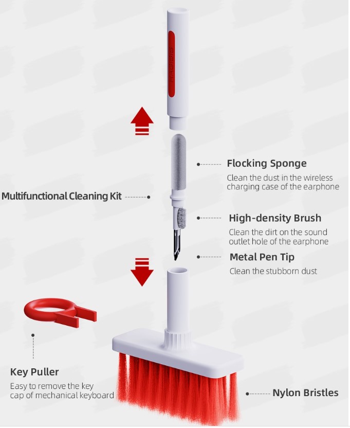 KLAVYE VE KULAKLIK TEMIZLEME SETIÜrün ÖzellikleriNaylon kıllar ile  bilgisayar temizleme kiti, sünger, fırça, Metal kalem ucu ve klavye tuş çektirmesi, çeşitli temizlik ihtiyaçlarını karşılamak için çift kafa gizli tasarımSünger kulaklık kablosuz şarj durumunda toz temizleyebilirsiniz. Fırça, kulaklığın ses çıkış deliğindeki kiri temizleyebilir. Metal kalem ucu inatçı tozu temizleyebilir4 çeşit temizlik kafası, çok amaçlı, klavye ve kulaklıkların her köşesinde derin temizlik yapabilirsiniz.Paket İçeriği1 Adet Klavye ve Kulaklık Temizleme Seti
