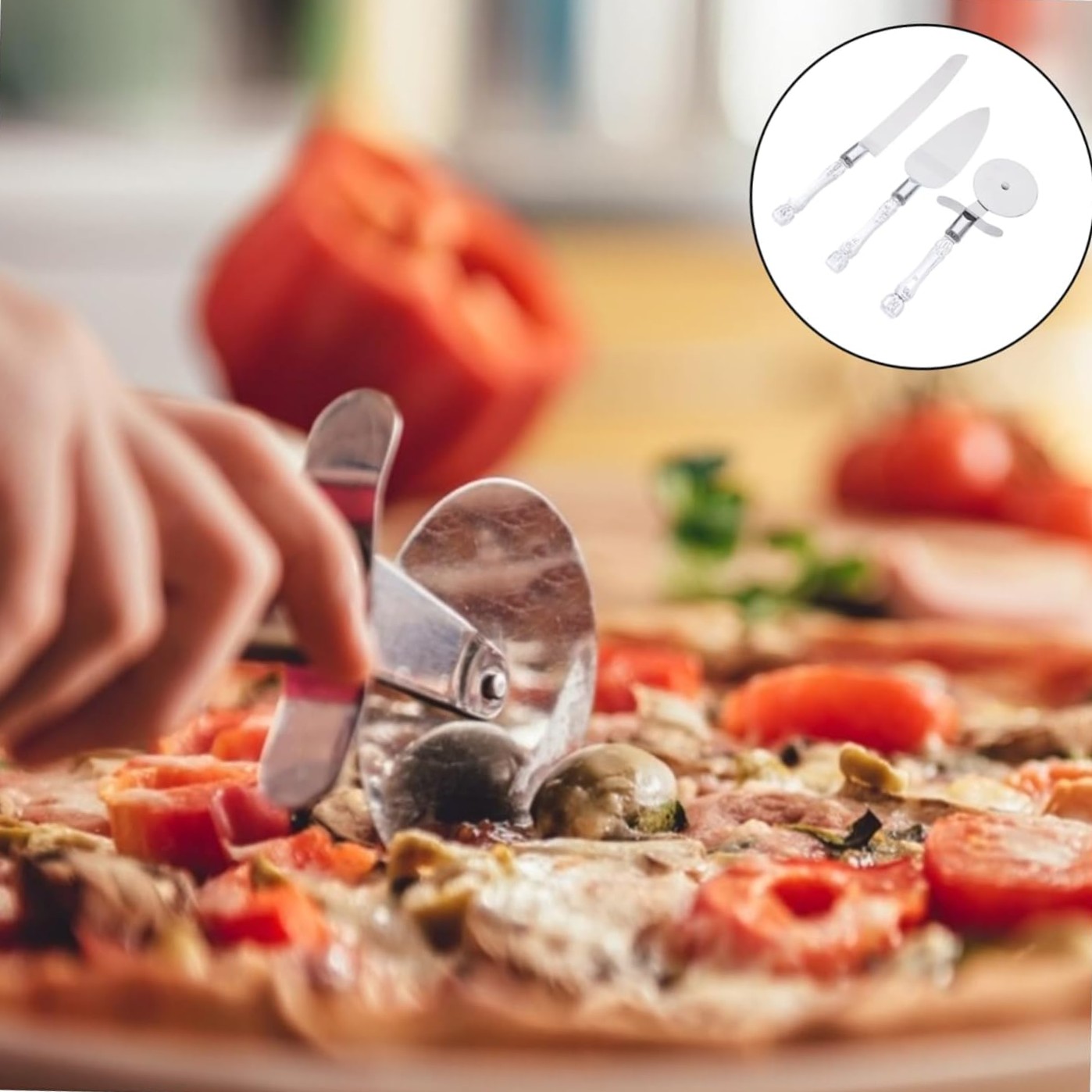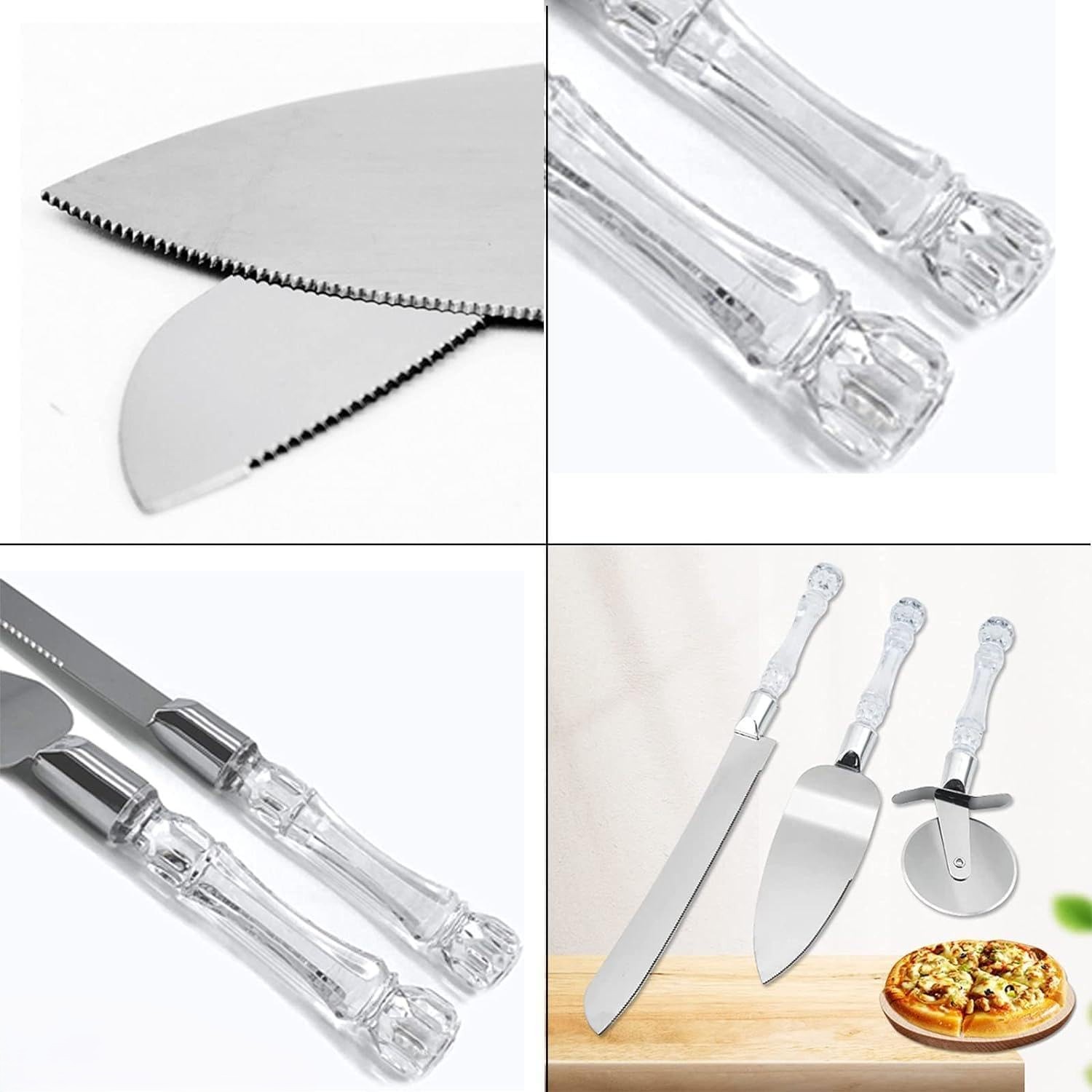 3 PARÇA SERVİS SETİÜrün Özellikleri 3 Parça Servis Seti, şeffaf sap tasarımı ve paslanmaz metal yüzeyleriyle mutfakta estetik ve fonksiyonel kullanım sunar. Pizza kesme aparatı, uzun servis bıçağı ve geniş spatula içeren bu set; pizza, börek, pasta, kek ve tatlı servislerinde kesim ve sunumu kolaylaştırır. Keskin dişli bıçak pizza dilimlerini dağılmadan kesmenizi sağlarken spatula, dilimleri düzgün şekilde tabağa aktarmanıza yardımcı olur. Yuvarlak pizza kesici ise hamur ve pizza tabanlarında pratik kullanım imkânı sunar. Şeffaf sap detayları sofralarda zarif bir görünüm oluştururken dayanıklı yapısı uzun süreli kullanım sağlar. Günlük mutfak hazırlıklarından özel davet ve organizasyonlara kadar her ortamda kullanıma uygundur ve hijyenik ambalajıyla teslim edilir. Paket İçeriği 1 Adet Pizza Kesici 1 Adet Dişli Bıçak 1 Adet Servis Spatulası