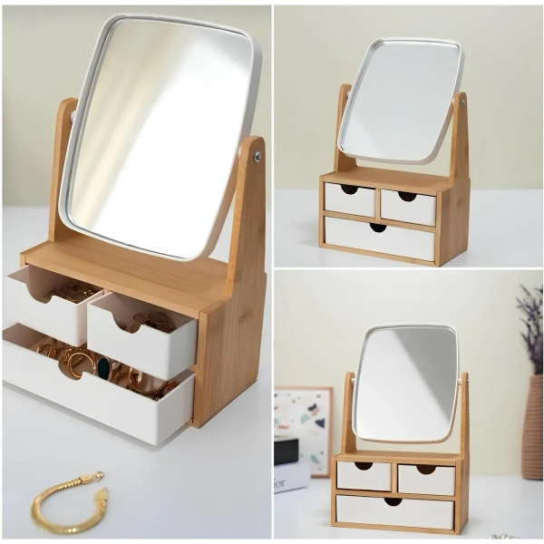 AHŞAP 3 ÇEKMECELİ AYNAÜrün Özellikleri Ahşap 3 çekmeceli ayna, şık ve fonksiyonel bir tasarıma sahiptir. Makyaj yaparken veya kişisel bakımınızı gerçekleştirirken rahatlıkla kullanabileceğiniz geniş bir aynaya sahiptir. Aynanın alt kısmında bulunan üç çekmece, takı, makyaj malzemeleri veya diğer küçük eşyalarınızı düzenli bir şekilde saklamanızı sağlar. Ahşap malzeme, doğal ve zarif bir görünüm sunar. Hem kullanım kolaylığı hem de estetik görünümü ile her türlü iç mekan için idealdir. Paket İçeriği 1 Adet Ahşap 3 Çekmeceli Ayna