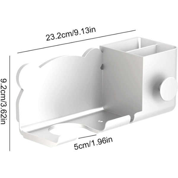 AYICIK FİGÜRLÜ SAÇ KURUTMA MAKİNESİ  TUTUCUÜrün ÖzellikleriPratik tasarımı sayesinde saç kurutma makinesi, düzleştirici, tarak ve diğer aksesuarlar için çok bölmeli bir yapı sunar. Güçlü yapışkanı sayesinde duvara kolayca monte edilebilir. Kaliteli ve dayanıklı plastik malzemeden üretilmiştir, uzun süreli kullanım için uygundur. Banyo tezgahında yer açarak düzen sağlar ve pratik bir kullanım imkânı sunar. Minimalist ve sade tasarımı, beyaz rengiyle her banyo dekorasyonuna uyum sağlar. Çok amaçlı kullanım olanağıyla saç kurutma makinesinin yanı sıra tarak, fırça ve kablo gibi aksesuarları düzenli bir şekilde saklamak için idealdir.Paket İçeriği1 adet ayıcık figürlü saç kurutma makinesi tutucu.