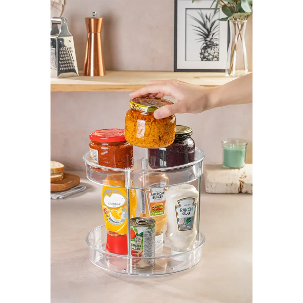 ÇOK AMAÇLI DÖNEBİLEN 2 KATLI ORGANİZERÜrün Özellikleri Çok amaçlı dönebilen 2 katlı organizer, 360° dönebilme özelliği sayesinde mutfakta, banyoda, makyaj masasında veya ofis ortamında düzeni sağlamak için pratik bir kullanım sunar. 23x22 cm boyutunda tasarlanmış olan bu organizer, dayanıklı ve kaliteli plastik malzemeden üretilmiştir. İki katlı yapısı sayesinde baharatlık, kozmetik ürünleri, temizlik malzemeleri, takı ve daha birçok eşyayı düzenli bir şekilde saklamaya imkân tanır. Döner taban sistemi sayesinde aradığınız ürüne kolayca erişebilirsiniz. Şık ve modern tasarımıyla hem işlevsel hem de dekoratif bir çözüm sunar. Paket İçeriği 1 adet Çok Amaçlı Dönebilen 2 Katlı Organizer