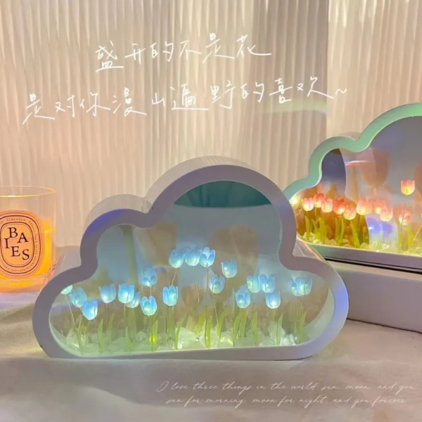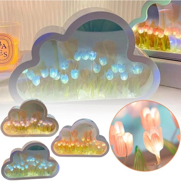 EL YAPIMI BÜYÜK BOY BULUT GECE LAMBASIÜrün ÖzellikleriBu pembe lale gece lambası, odanızı daha konforlu hale getiren sevimli bir dekorasyondur. Bulut aynalı lale lambası, hem masaüstü dekorasyonu hem de küçük bir ayna olarak kullanılabilir. Her çiçek istediğiniz konuma ayarlanabilir ve iki adet AA pil ile çalışır (piller dahil değildir).Ürün ÖlçüleriGenişlik: 20 cmUzunluk: 13 cmPaket İçeriği1 adet El Yapımı Büyük Boy Bulut Gece Lambası