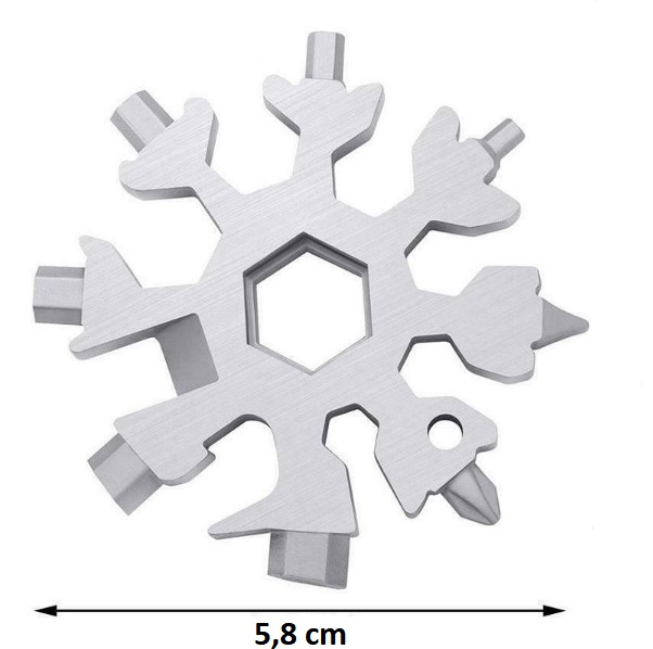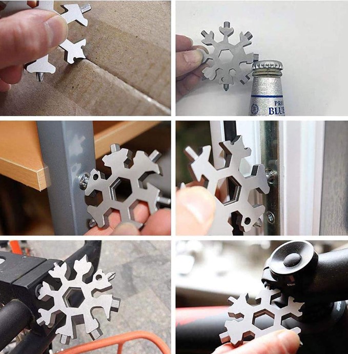 Kar Tanesi Çok Amaçlı Anahtarlık AçacakÜrün ÖzellikleriKar tanesi anahtarları son derece çok yönlüdür. Şişe açacağı, kutu açacağı, tornavida, emniyet çekiç, altıgen anahtar vb. Olarak kullanılabilir.18+1 çeşit düz yıldız tornavida, alyan, civata anahtarı, meşrubat açacağı, koli kesme gibi bir çok işlerinizi tek ürünle çözebilirsiniz.Avuç içine sığan küçük boyutu ile cebinizde veya çantanızda kolaylıkla taşıyabilirsiniz.Paslanmaz çelikten üretilmiştir.Her evde, araçta ve özellikte bisiklette motosiklet gibi ulaşım araçlarında bulunması gereken müthiş bir ürün.Dağcılık veya yürüyüş gibi açık hava sporlarında yanınıza almalısınız. Paket İçeriği1 Adet Kar Tanesi Çok Amaçlı Anahtarlık Açacak