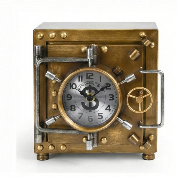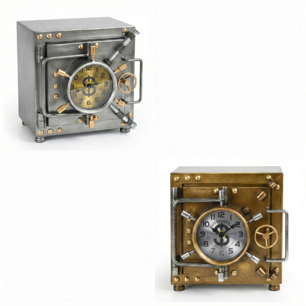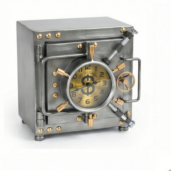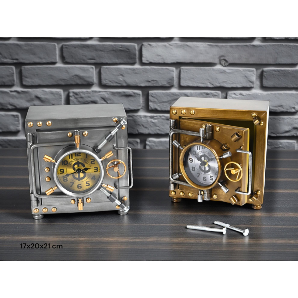 KASA TASARIMLI MASAÜSTÜ SAATÜrün Özellikleri Kasa tasarımlı masaüstü saat, klasik kasa kapaklarından ilham alan detaylı ve özgün görünümüyle dekoratif saat kategorisinde öne çıkan özel bir modeldir. Metal görünümlü gövdesi, vidalı ve kilitli kasa detayları sayesinde endüstriyel ve retro dekorasyon tarzını başarıyla yansıtır. Saatin ön yüzünde yer alan yuvarlak kadran, net rakam yapısı ile kolay okunabilirlik sunarken mekanik kasa hissi veren tasarımı bulunduğu ortamda dikkat çekici bir dekor unsuru oluşturur. 17x20x21 cm ölçüleri sayesinde masa, raf, kitaplık, ofis masası veya vitrin üzerinde dengeli ve güçlü bir duruş sergiler. Sessiz akan mekanizması sayesinde çalışma, dinlenme ve ofis ortamlarında rahatsızlık oluşturmaz. Dayanıklı yapısı uzun süreli kullanım için uygundur. Renk seçeneği bulunmamaktadır; ürün gümüş veya altın tonlu kasa seçeneklerinden karışık olarak gönderilmektedir. Hem fonksiyonel hem de dekoratif bir masa saati arayanlar için şık ve farklı bir alternatiftir. Paket İçeriği 1 adet kasa tasarımlı masaüstü saat