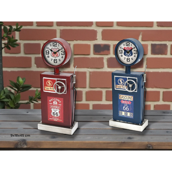 KLASİK BENZİNLİK TASARIMLI MASAÜSTÜ SAATÜrün Özellikleri Klasik benzinlik tasarımlı masaüstü saat, nostaljik benzin istasyonlarından ilham alan özgün gövde yapısı ve Route 66 temalı detaylarıyla dekorasyona karakter kazandıran özel bir modeldir. Dikey formu ve üst bölümde konumlandırılmış yuvarlak saat kadranı, klasik masa saatlerinden ayrışarak güçlü bir görsel etki oluşturur. Gövde üzerinde yer alan benzin pompası hortumu, vana ve retro grafik baskılar ürüne gerçekçi ve koleksiyonluk bir görünüm kazandırır. Net ve büyük rakamlara sahip analog kadranı sayesinde saat kolayca okunabilir ve hem dekoratif hem işlevsel bir kullanım sunar. 9x18x45 cm ölçüleriyle masa, raf, konsol, kitaplık veya vitrin üzerinde dikkat çekici bir duruş sergiler. Sessiz çalışan mekanizması sayesinde ofis, çalışma odası veya yaşam alanlarında rahatsız edici bir ses oluşturmaz. Dayanıklı malzemeden üretilmiş yapısı uzun ömürlü kullanım sağlar. Renk seçimi yapılamamaktadır; ürün kırmızı veya mavi renk seçeneklerinden biri olacak şekilde karışık gönderilmektedir. Retro, vintage ve endüstriyel dekorasyon tarzlarını tamamlayan bu masaüstü saat, dekoratif obje arayanlar için ideal bir tercihtir. Paket İçeriği 1 adet klasik benzinlik tasarımlı masaüstü saat