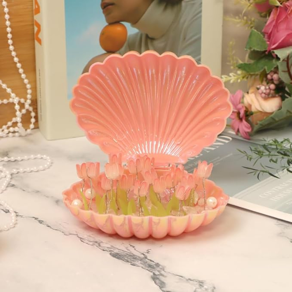LED IŞIKLI KENDİN YAP DENİZ KABUĞU TASARIMLI LALE LAMBAÜrün Özellikleri Estetik tasarımıyla dikkat çeken LED ışıklı deniz kabuğu lamba, içindeki lale figürleriyle birlikte şık bir dekoratif ürün haline gelir. Kendin yap (DIY) set olarak sunulan ürün, içerisinde LED ışık, yapay laleler, dekoratif taşlar ve montaj aparatı ile birlikte gelir. Açılabilir pembe deniz kabuğu tasarımı sayesinde hem gece lambası hem de süs objesi olarak kullanıma uygundur. Yumuşak LED ışığı ortama sıcaklık katarken, ev dekorasyonuna romantik bir hava verir. Özellikle hediye olarak da tercih edilebilecek bu ürün, kullanıcıya kendi tasarımını oluşturma keyfi sunar. Paket İçeriği 1 Adet LED Işıklı Kendin Yap Deniz Kabuğu Tasarımlı Lale Lamba