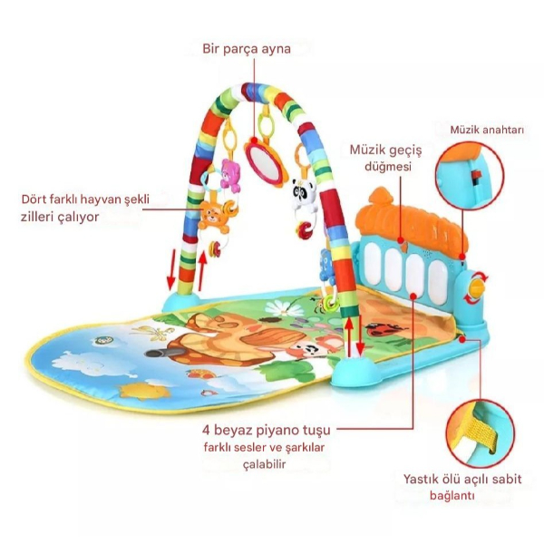 PİYANOLU MANTAR OYUN HALISIÜrün ÖzellikleriPiyanolu Mantar Oyun Halısı, bebekler için eğlenceli ve öğretici bir oyun alanı sunarak motor ve duyusal gelişimlerine katkıda bulunur. Yumuşak zemini sayesinde bebeklerin rahatça hareket etmesine olanak tanırken, müzikli piyano tuşları ve asılı oyuncakları ile dikkatlerini çeker. 4 farklı piyano tuşu sayesinde farklı sesler ve melodiler çalabilir, üzerinde dört farklı hayvan şeklinde çıngıraklı oyuncak yer alır. Ayrıca, bebeklerin kendilerini keşfetmeleri için güvenli bir ayna içerir. Farklı modlara geçiş yapabilme özelliği ile 0-12 ay arasındaki bebekler için uygundur. 0-6 ay arasındaki bebeklerin uzanarak oynaması için,  6+ ay bebeklerin oturarak oyun oynayabileceği bir yapıdadır.2 adet AA pil ile çalışır (piller dahil değildir).Paket İçeriği1 Adet Piyanolu Mantar Oyun Halısı