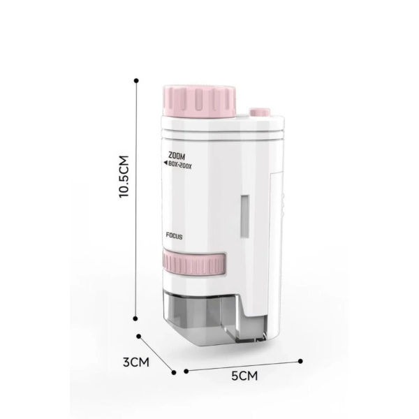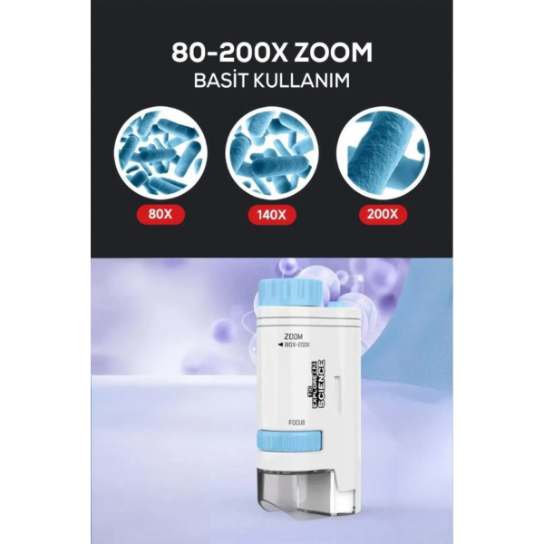 PORTATİF MİNİ MİKROSKOPÜrün Özellikleri Portatif mini mikroskop, 10.5 cm x 5 cm x 3 cm boyutlarıyla kompakt ve taşınabilir bir kullanım sunar. 80x ila 200x arasında yakınlaştırma yapabilen zoom özelliği sayesinde detayları net şekilde inceleme imkânı sağlar. Dahili LED aydınlatması sayesinde karanlık ortamlarda bile net görüntü elde edilebilir. Üzerindeki odaklama ve yakınlaştırma ayar düğmeleriyle görüntü kontrolü kolayca yapılabilir. El tipi tasarımı ile okul projeleri, doğa gözlemleri, hobi ve eğitim amaçlı kullanımlar için idealdir. Hafif yapısı sayesinde çantada taşınabilir ve istenilen her yerde anında kullanılabilir. Çocuklar ve yetişkinler için eğlenceli ve öğretici bir üründür. Paket İçeriği 1 Adet Portatif Mini Mikroskop