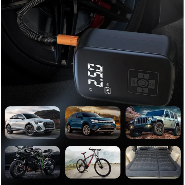 ŞARJLI HAVA KOMPRESÖRÜÜrün Özellikleri Şarjlı hava kompresörü, dijital LED ekranlı ana ünitesi sayesinde gerçek zamanlı basınç ölçümü yapabilir ve Bar, PSI, KPA gibi birimlerde takip imkânı sunar. Belirlenen basınca ulaştığında otomatik kapanma özelliği ile güvenli ve pratik bir kullanım sağlar. Kompakt ve taşınabilir yapısıyla öne çıkan cihaz, dayanıklı örgü korumalı hava hortumu sayesinde yüksek basınca karşı dayanıklıdır. Mandallı vana başlığı sayesinde kolay bağlantı yapılabilir. Ürünle birlikte gelen çoklu başlık adaptörleri arasında bisiklet vanası, motor vanası, top iğnesi ve şişme oyuncak adaptörü yer alır. Powerbank ya da araç şarjı ile kolayca şarj edilebilir olması, mobil kullanımda büyük kolaylık sağlar. Araba, motosiklet ve bisiklet lastikleri ile birlikte futbol, basketbol, voleybol gibi spor topları ve şişme yatak, deniz botu gibi ürünlerde rahatlıkla kullanılabilir. Hafif tasarımı, basınç birimi seçme imkânı ve hızlı şişirme kapasitesi ile kullanıcıya pratik bir çözüm sunar. Şarjlı kullanımı sayesinde kabloya bağlı kalmadan her ortamda kullanılabilir. Paket İçeriği 1 Adet Şarjlı Hava Kompresörü
