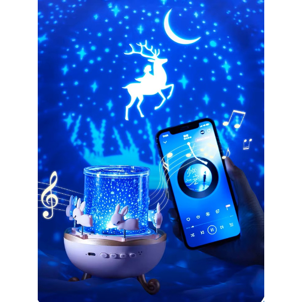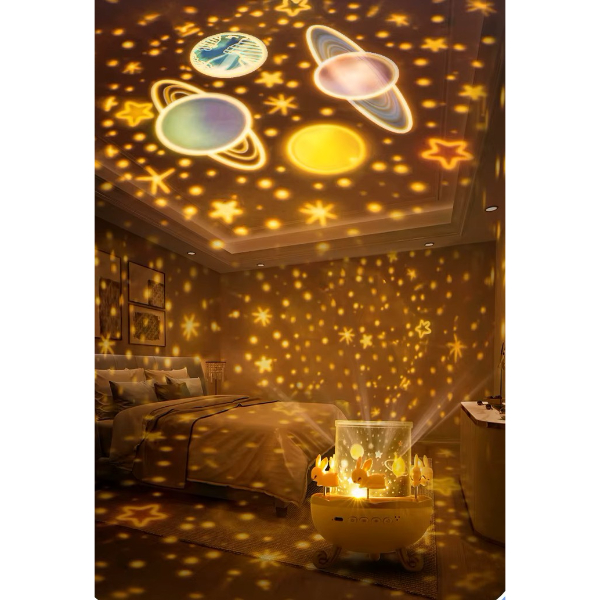 TAVŞAN ATLIKARINCA MULTİFONKSİYON PROJEKTÖRÜrün Özellikleri Tavşan Atlıkarınca Multifonksiyon Projektör, müzik kutusu olarak da çalışabilen ve mobil cihazlar ile Bluetooth üzerinden müzik çalabilen bir üründür. Üst kısmındaki ve içteki tavşan figürleri döner, geceyi daha eğlenceli hale getirir. Cihaz, farklı ışık seviyeleri sunarak loş, orta ve güçlü aydınlatma seçenekleriyle ortamın aydınlatmasını değiştirir. Sıcak ışık, nötr ışık ve renkli ışık seçenekleriyle atmosferin tarzını değiştirebilirsiniz. Gökyüzü desenleri ve sevimli desenler içeren 12 farklı projeksiyon film diski sayesinde duvar ve tavana yıldızlar veya çeşitli desenler yansıtılabilir. USB ile şarj edilebilen bu projektör, bebek/çocuk odalarında kullanılabileceği gibi, gece lambası, uyku yardımcısı ya da hediye olarak da tercih edilebilir. Paket İçeriği 1 Adet Tavşan Atlıkarınca Multifonksiyon Projektör