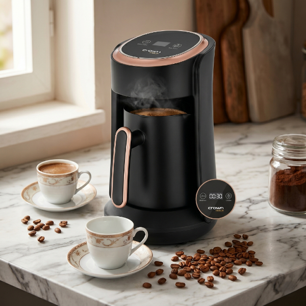 CROWN GOLD TEK HAZNELİ OTOMATİK TÜRK KAHVE MAKİNESİ  Ürün Özellikleri Mutfağınızda yer kaplamayan profesyonel bir kahve deneyimine hazır olun! Crown Gold Tek Hazneli Otomatik Türk Kahve Makinesi, kompakt tasarımı ve üstün pişirme teknolojisiyle her fincanda köz tadında, bol köpüklü kahveler sunar. 800W güç performansıyla hızlı sonuçlar verirken, 4 fincanlık ideal kapasitesi sayesinde hem kendiniz hem de misafirleriniz için yeterli hacmi sağlar. Sesli uyarı sistemi ve dijital LED göstergesi, kahveniz hazır olduğunda sizi bilgilendirerek taşma veya başında bekleme derdini ortadan kaldırır. Otomatik kapanma özelliği ile güvenliği elden bırakmayan bu cihaz, 360° dönebilen kablosuz taban yapısı sayesinde sağ ve sol el kullanımına uygun ergonomik bir deneyim sunar. Şık siyah ve rose gold detaylarıyla mutfağınıza modern bir estetik katan bu makine, geleneksel lezzeti en teknolojik haliyle evinize getirir. Ürün Teknik Özellikleri Özellik Açıklama Güç 800W Hızlı Pişirme Performansı Kapasite 4 Fincan Kapasiteli Tek Cezve Pişirme Teknolojisi Közde Kahve Lezzeti / Akıllı Pişirme Sensörü Güvenlik Sistemleri Otomatik Kapanma, Taşma Emniyeti & Sesli Uyarı Kontrol Paneli Dijital LED Gösterge Ekranı Kullanım Kolaylığı 360° Kablosuz Kullanım ve Ergonomik Tasarım Üretim Yerli Üretim Kalitesi Paket İçeriği 1 Adet Crown Gold Tek Hazneli Otomatik Türk Kahve Makinesi