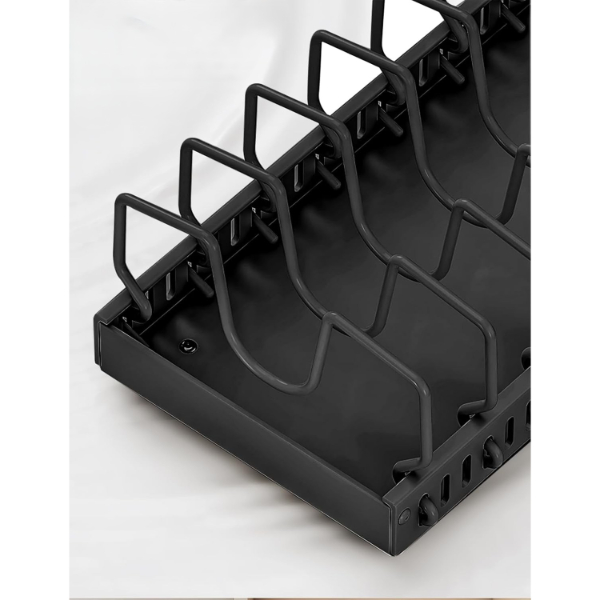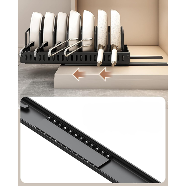 TELESKOPİK RAYLI TAVA TENCERE ORGANİZERİÜrün Özellikleri Teleskopik raylı tava tencere organizeri, mutfakta yer tasarrufu sağlamak ve mutfak gereçlerini düzenli şekilde yerleştirmek için ideal bir çözümdür. Dayanıklı siyah metal malzemeden üretilmiş olan ürün, elektrostatik boya kaplaması sayesinde şık bir görünüm sunar. 6 bölmeli yapısı ile tencere, tava, kapak veya tepsileri dikey şekilde yerleştirmenizi sağlar. Delme gerektirmeyen nano yapışkan bantlar sayesinde kolayca monte edilirken, istenirse vida ile de sabitlenebilir. Dolap içi, tezgah üstü veya çekmece içi kullanımlar için uygundur. Kaymaz yapısı ve sağlam gövdesi ile tavalar arasında oluşabilecek çizilmeleri ve deformasyonu önler. Farklı boyutlardaki tavalara uyum sağlayarak mutfak organizasyonunda maksimum verim sunar. Paket İçeriği 1 Adet Teleskopik Raylı Tava Tencere Organizeri