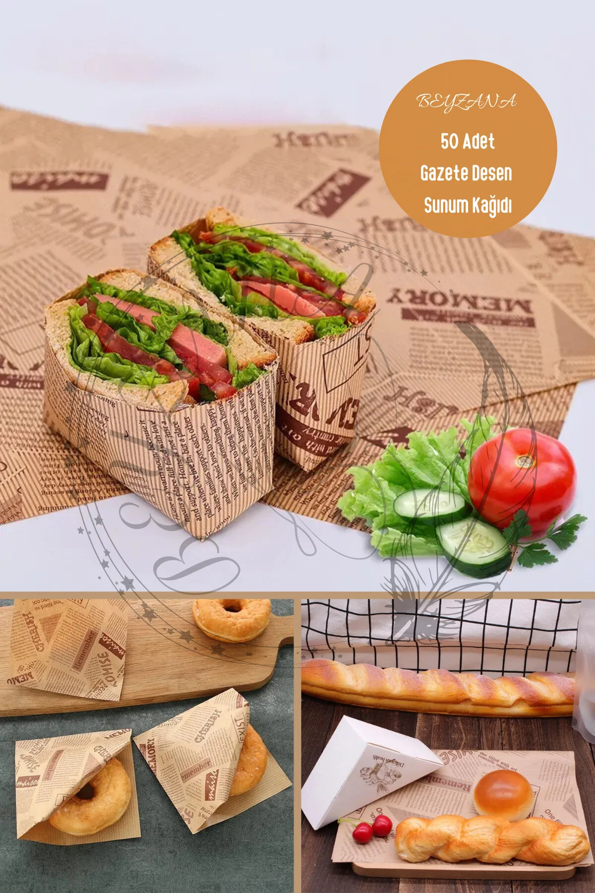 VINTAGE GAZETE DESENLİ SUNUM KAĞIDI 50 ADETZamansız Şıklık ve PratiklikYemek sunumunuza nostaljik bir dokunuş katın ve sunumlarınızı benzersiz kılın! Vintage gazete desenli sunum kağıdı, hem göz alıcı bir estetik sunar hem de kullanım kolaylığı sağlar. Bu özel tasarım yağlı kağıt, dayanıklı yapısı ve su geçirmez özelliği sayesinde sandviç, hamburger ve diğer lezzetli yiyeceklerinizi güvenle sararak sunmanızı mümkün kılar. Retro gazete desenleri ile sofralarınıza klasik bir hava katan bu ürün, aynı zamanda hijyenik ve gıda temasına uygun malzemelerden üretilmiştir.Yemek sunumu konusunda yenilikçi çözümler arayanlar için ideal olan bu sunum kağıdı, kafe, restoran ve ev kullanımı için mükemmel bir seçimdir. Sandviçlerinizi, kurabiyelerinizi ve diğer aperatiflerinizi bu şık kağıtlarla sarmak, misafirlerinize ve müşterilerinize unutulmaz bir deneyim sunmanızı sağlar. Kolayca katlanabilir ve kesilebilir yapısıyla pratik bir kullanım sunan vintage gazete desenli sunum kağıdı, aynı zamanda çevre dostu ve geri dönüştürülebilir materyallerden üretilmiştir.Sofralarınıza geçmişin büyüsünü taşıyan bu zarif ürün, stil ve işlevselliği bir araya getirerek, yemek sunumunuza farklı bir boyut kazandırır. Özel etkinliklerde, günlük sunumlarda ya da paket serviste rahatlıkla kullanabileceğiniz vintage gazete desenli sunum kağıdı, mutfağınızın vazgeçilmez bir parçası olacak. Nostaljinin şıklığını ve pratikliğini bir arada sunan bu eşsiz kağıtlarla, yemek sunumlarınızı sıradanlıktan çıkarın ve her anınızı özel kılın.Paket İçeriği50 adet vintage gazete desenli sunum kağıdı